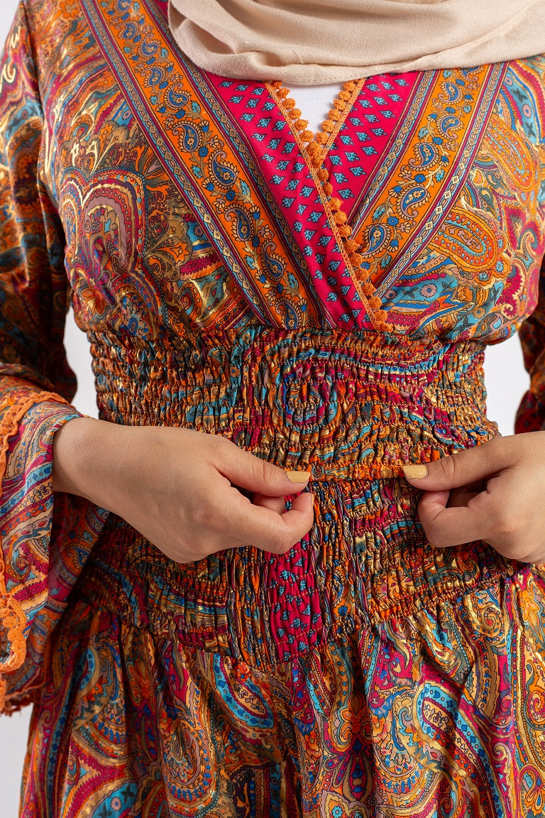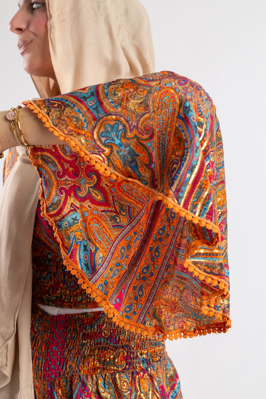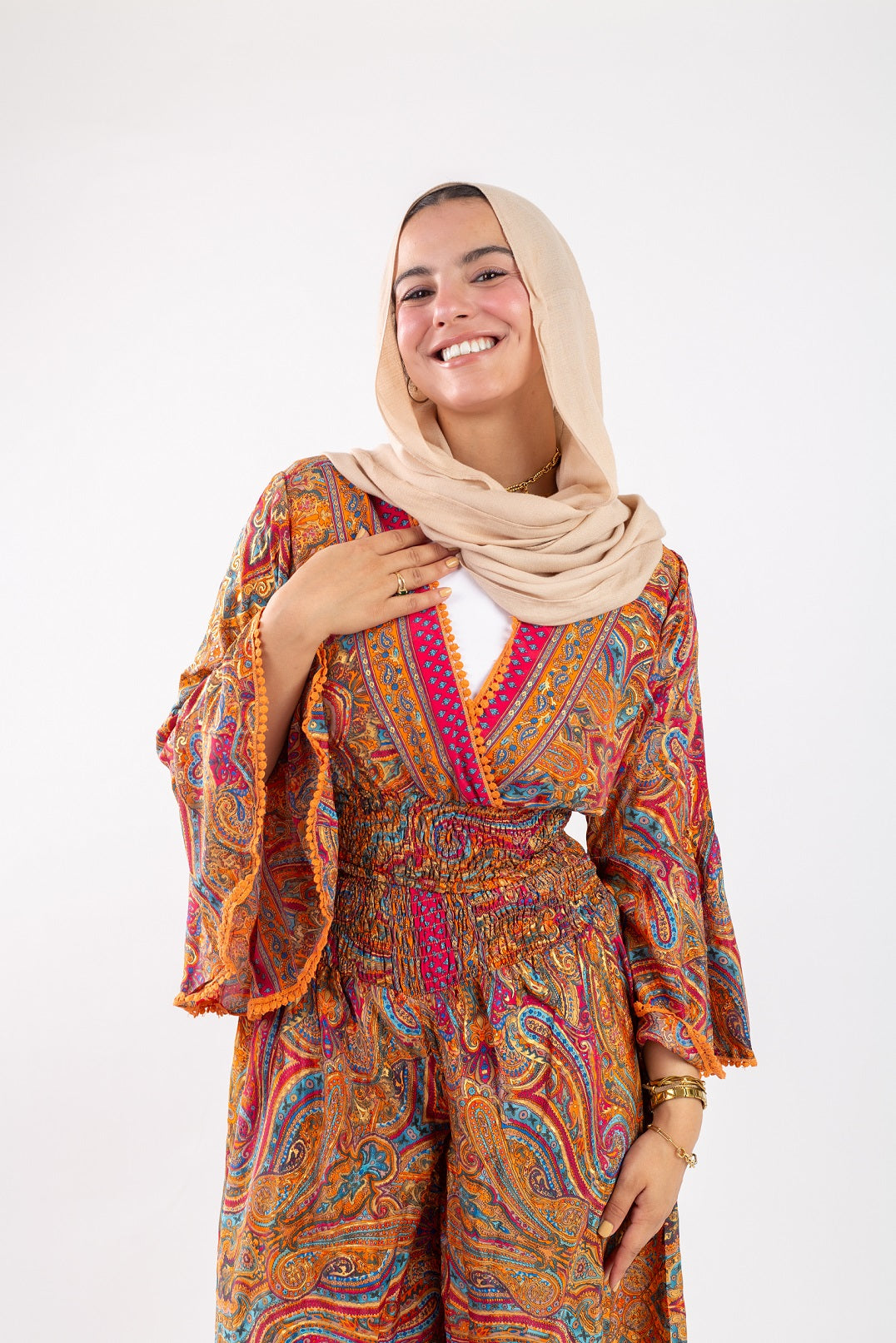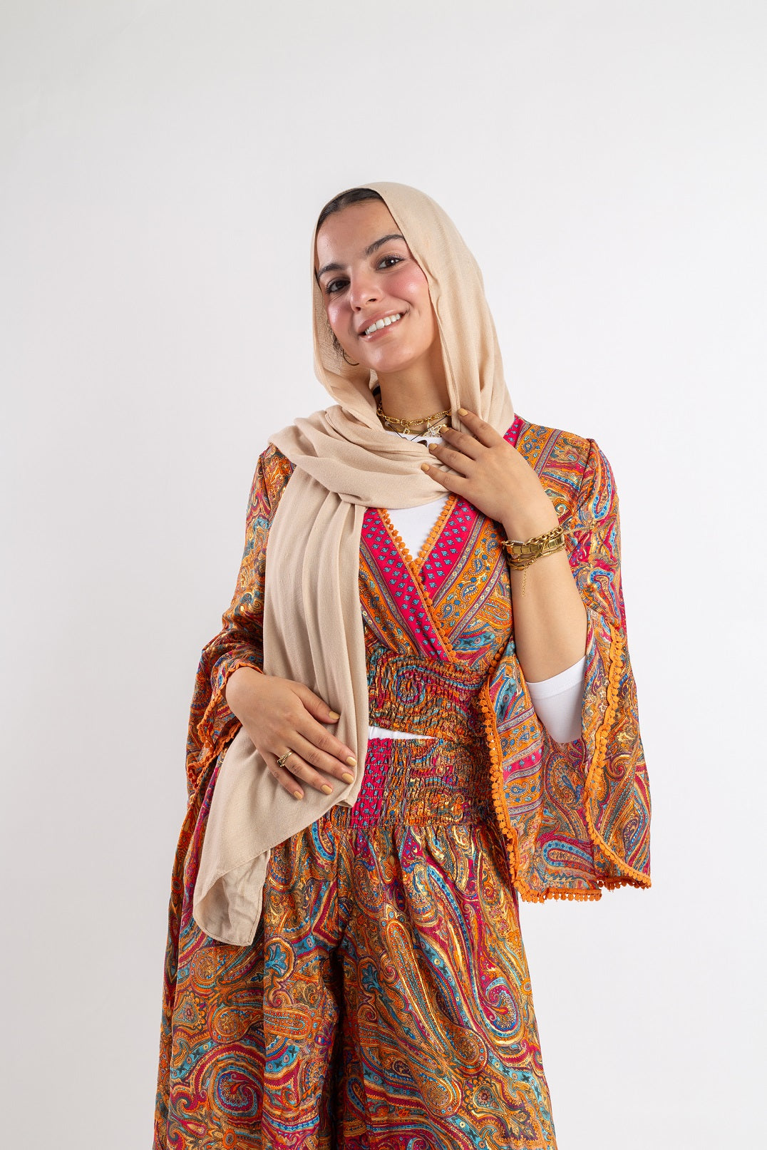 Our Indian Suit blends cultural elegance with modern modesty. Made from soft, breathable Indian fabric, it features a graceful silhouette, detailed finishes, and a comfortable fit. Perfect for festive events, gatherings, or elegant everyday wear. The suit includes a matching top and wide-leg trousers for a coordinated look. Available in multiple sizes and rich tones.