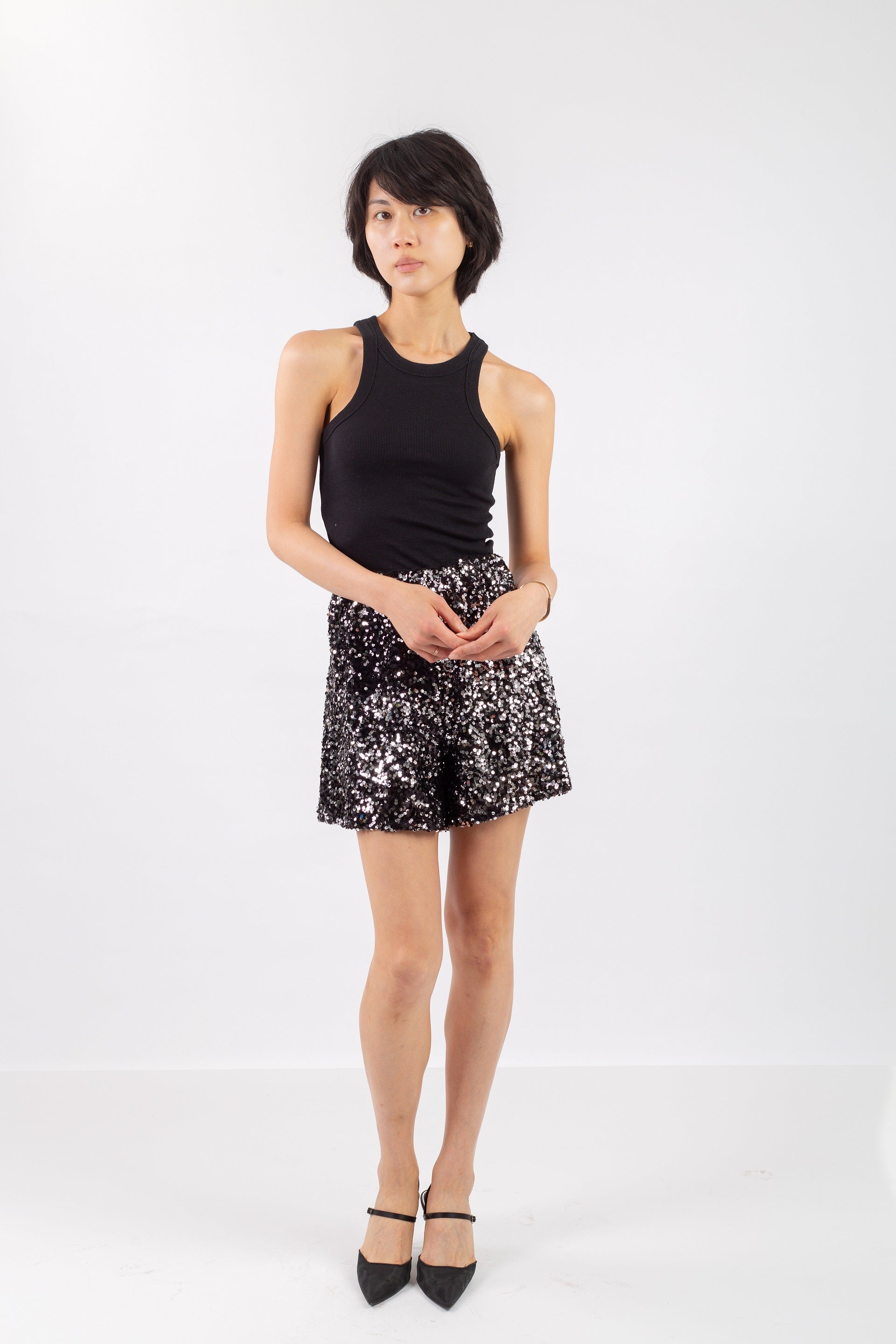 Add bold shimmer to your wardrobe with the Glitzy Sequin Shorts, made from high-quality soiree fabric. Featuring all-over sequin detailing and a comfortable elastic waistband, these shorts offer both sparkle and ease of movement. Ideal for styled layering, festive occasions, or fashion-forward looks. Available in multiple sizes and statement shades.